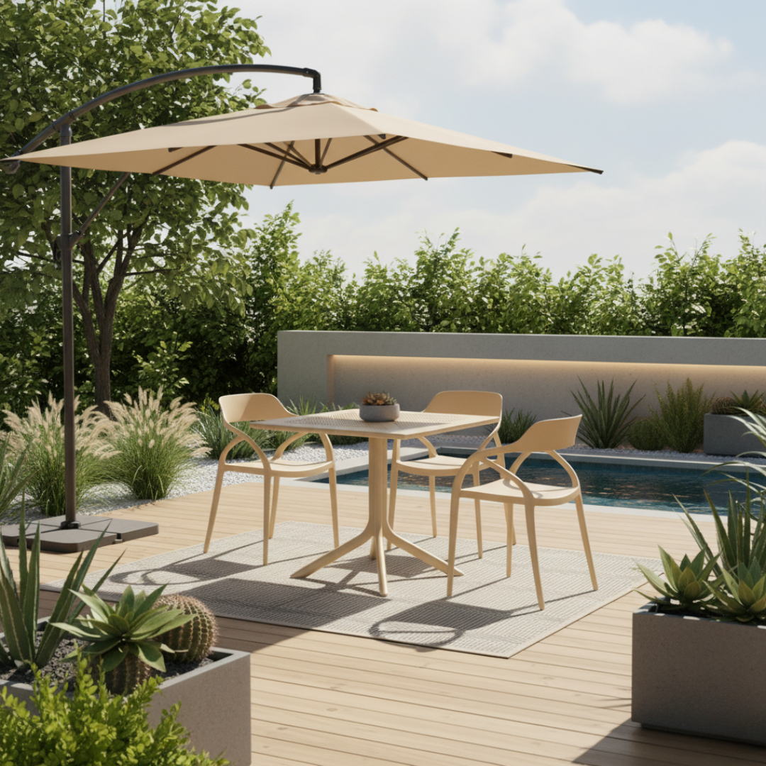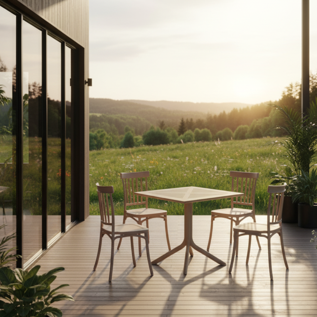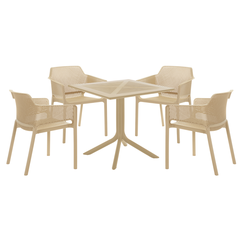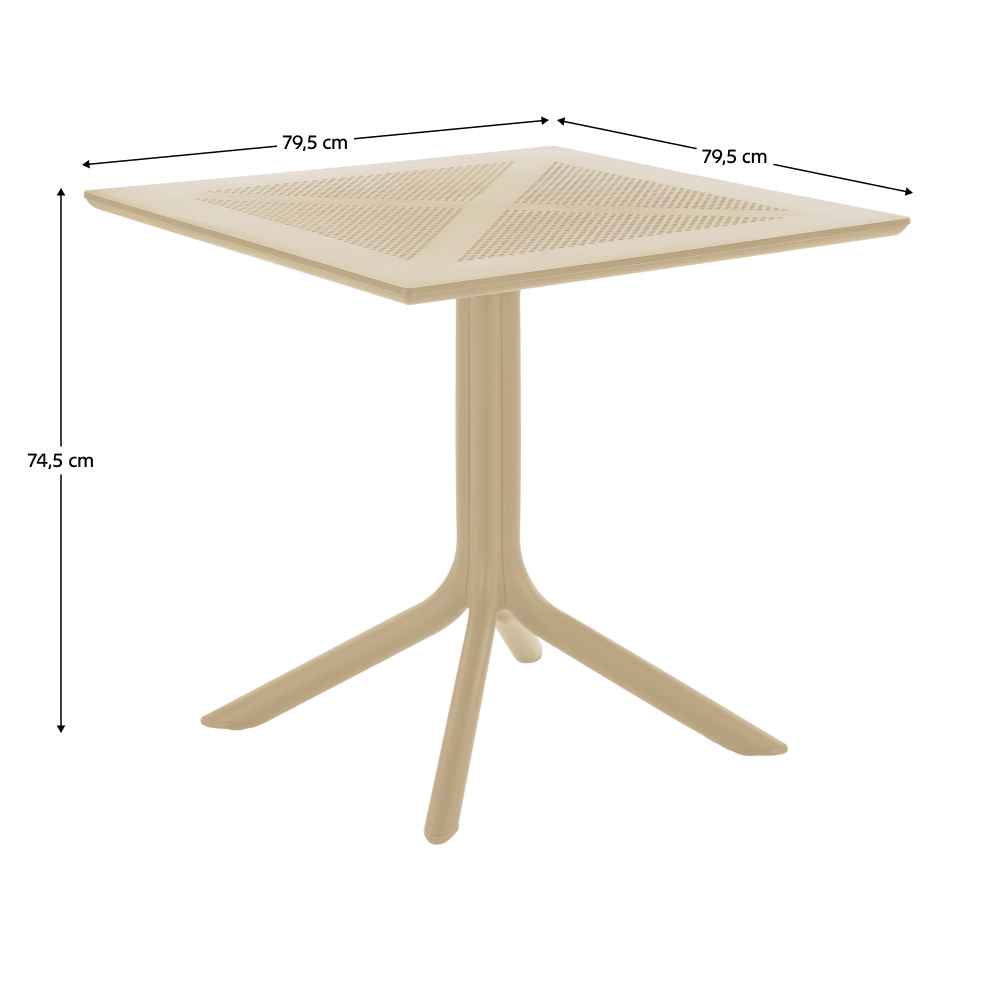 Material: plastic Culoare: gri-maro Taupe Dimensiuni (LxAxÎ): 79,5x79,5x74,5 cm Capacitate de încărcare: 50 kg Greutate: 10,5 kg Simplă Practică Pe picioare Masă de dining / grădină Potrivită pentru interior şi exterior Masă de dining pentru 4 persoane Livrată dezasamblată