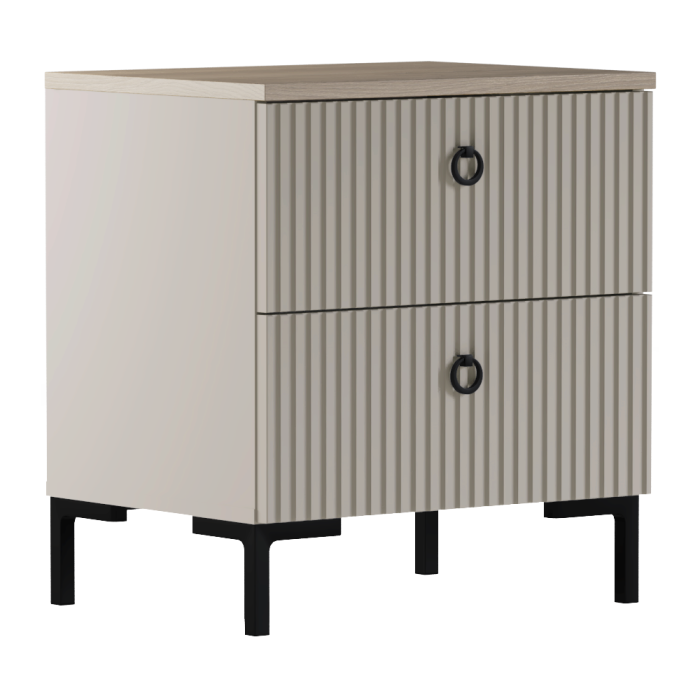 Material: MDF laminat DTD/înfoliat Culoare: gri-maroniu Taupe/stejar silverjack Dimensiuni (lxAxh): 53,2x40,7x58,6 cm Grosimea materialului DTD: 1,6-1,8 cm Grosimea materialului MDF: 1,9 cm Două sertare Portanţă placă superioară: 10 kg Portanţă sertar: 3 kg Cu mânere Material mâner: metal Culoare mâner: negru mat Pe picioare Înălţimea picioarelor: 12 cm Material picior: plastic Culoare picior: negru mat Uşi decorative frezate Design modern Recomandăm fixarea pe perete Livrat dezasamblat