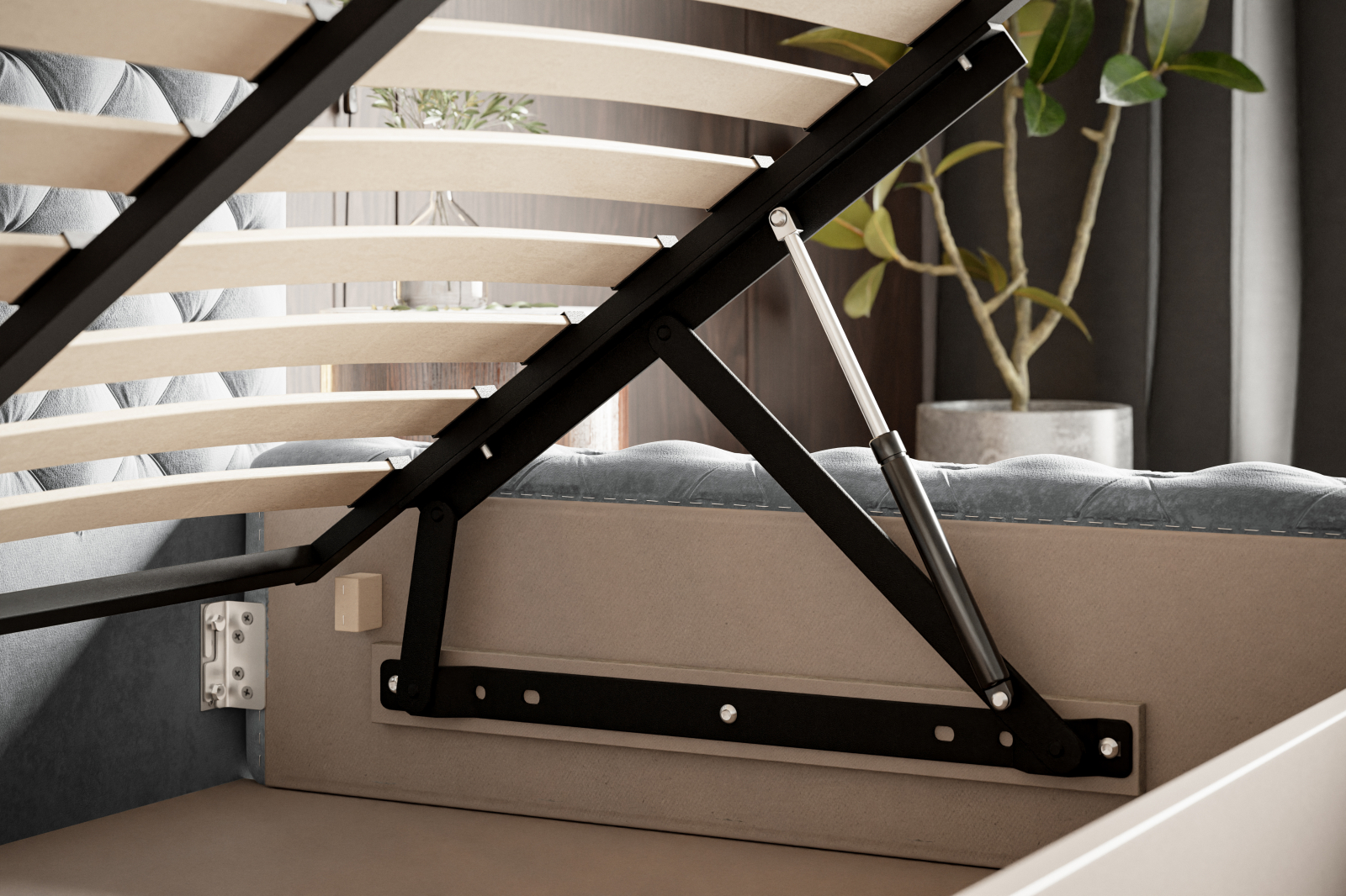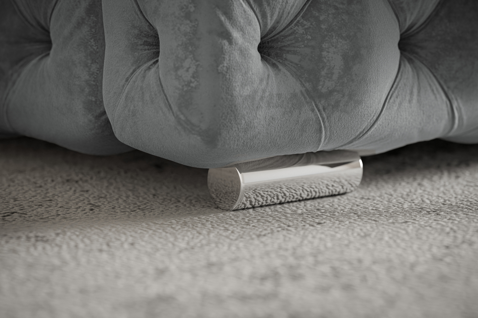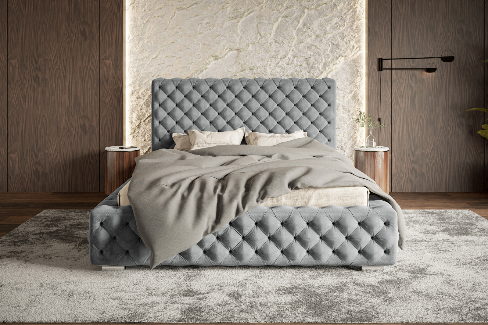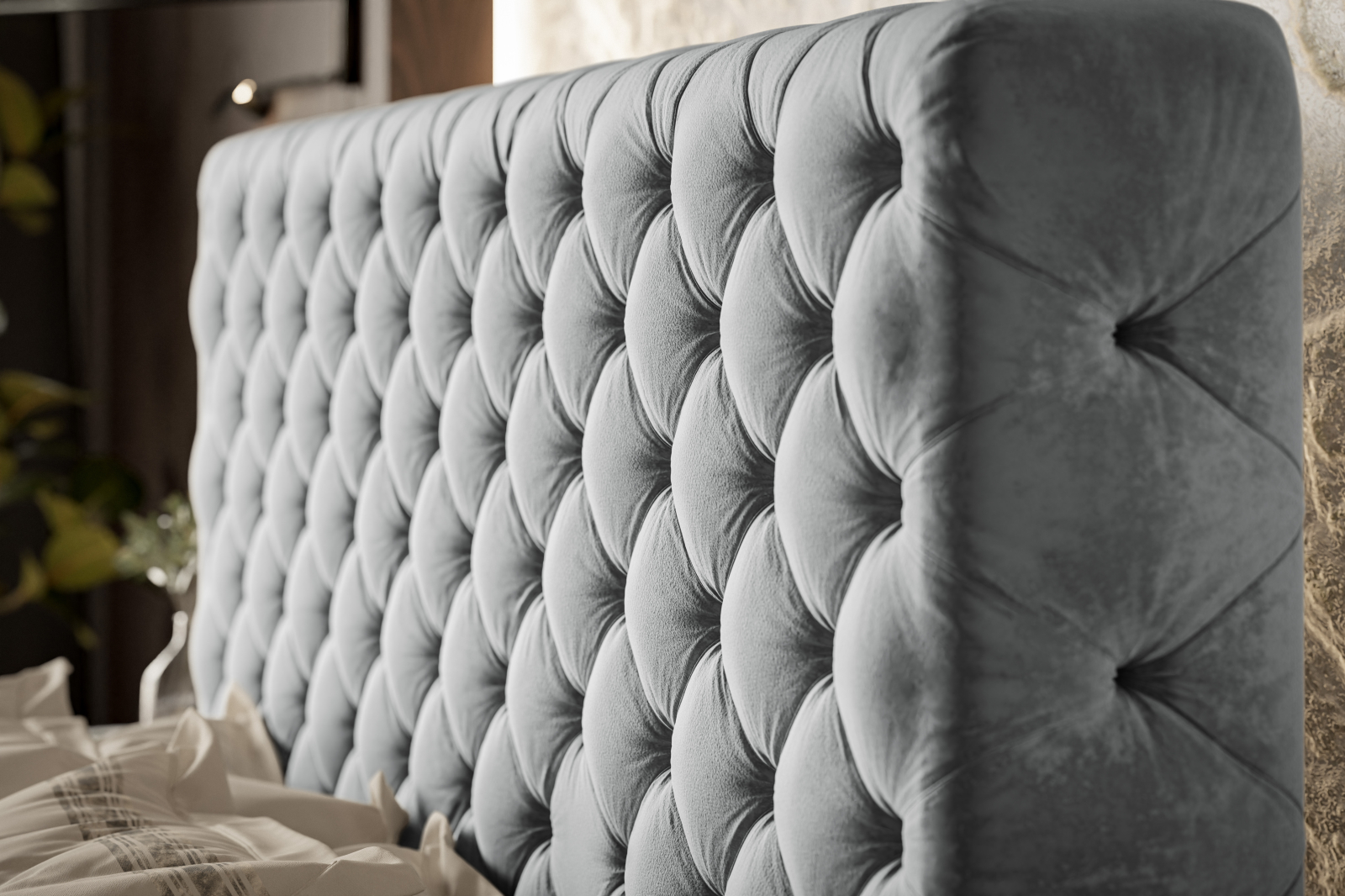 Pat tapitat dormitor, Chesterfield, 160x200, modern Lux ,, somiera metalica rabatabila, cu lada , matlasat , stofa catifelata Gri inchis, picioare metalice cromate, Bortis