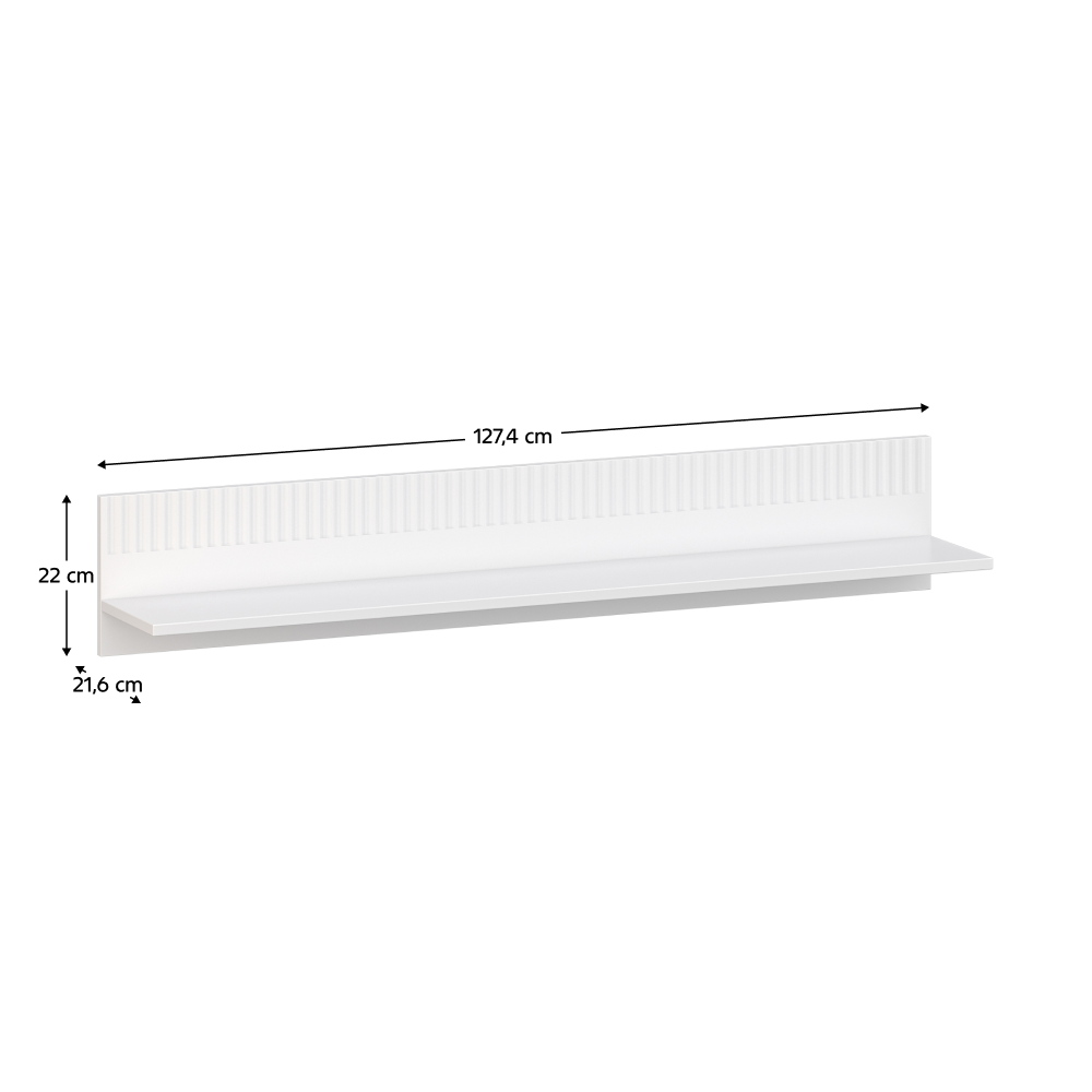 Material: DTD laminat/MDF înfoliat/PVC Culoare: albă Dimensiuni (lxAxh): 127,4x21,6x22 cm Grosimea materialului: 1,6 cm De perete Portanţă poliţă: 8 kg Design modern Vă recomandăm să fixaţi mobilierul de perete Livrată dezasamblată