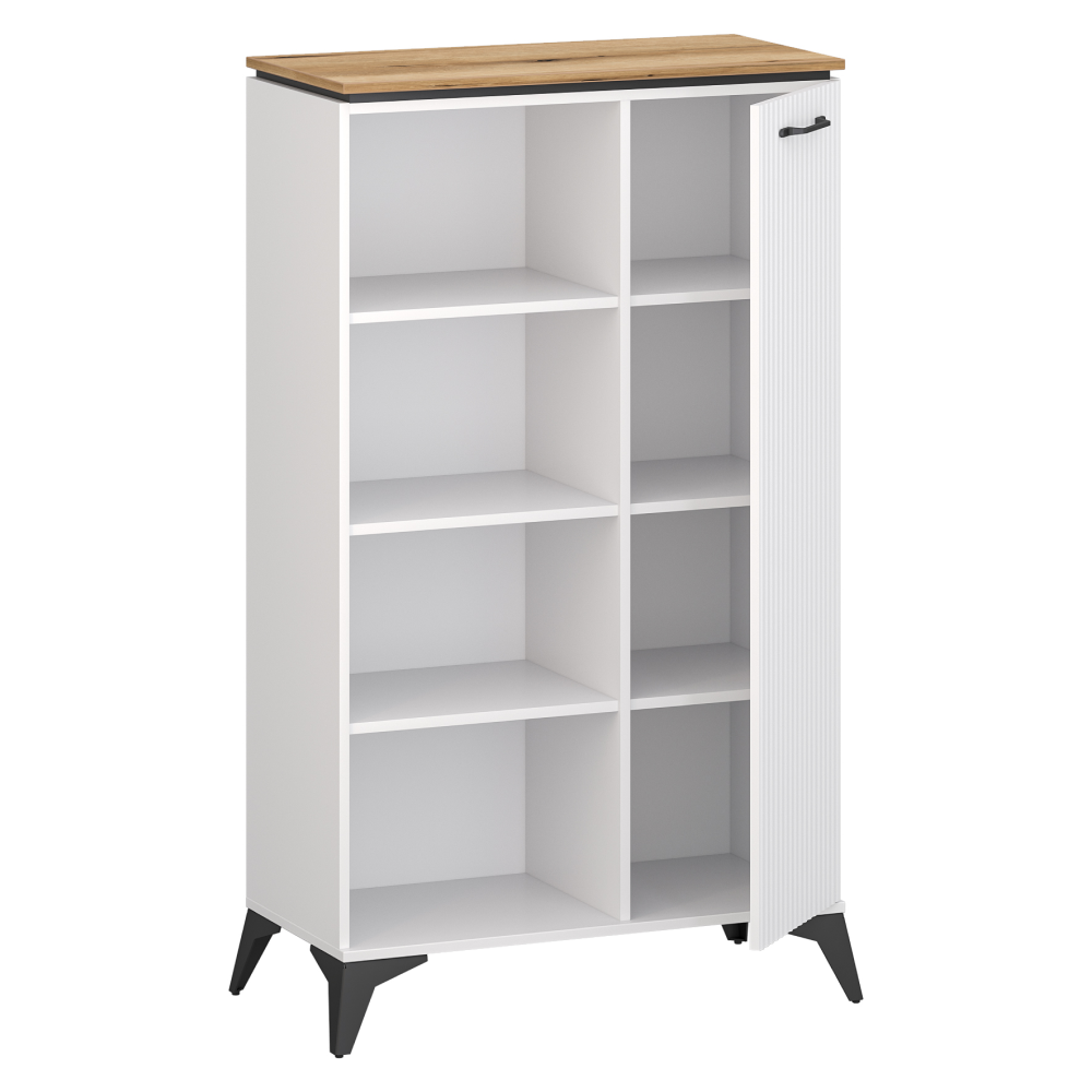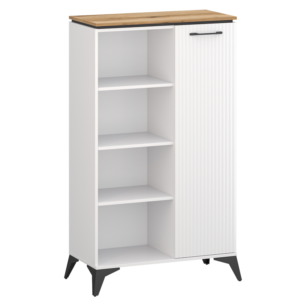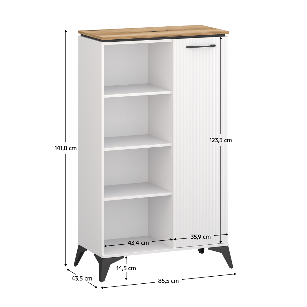 Material: DTD laminat/MDF înfoliat/PVC Culoare: alb/stejar evoke Dimensiuni (lxAxh): 85,5x43,5x141,8 cm Grosimea materialului: 1,6 cm Cu o uşă Spaţiu de depozitare deschis Cu poliţă Portanţă poliţă: 3 kg Portanţa blatului superior: 30 kg Mânere metalice Culoare mânere: neagră Pe picioare Culoare picioare: negre Înălţime picioare: 14,5 cm Uşă frezată decorativ Design modern Recomandăm fixarea de perete Livrată dezasamblată