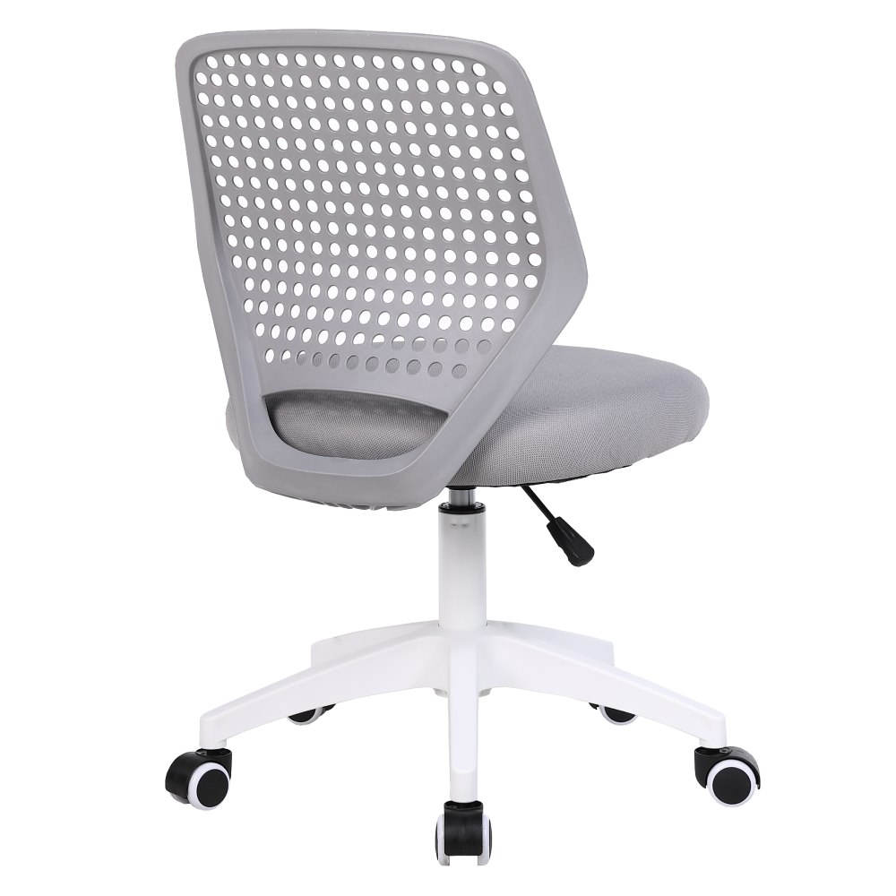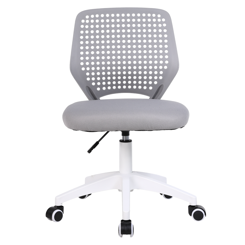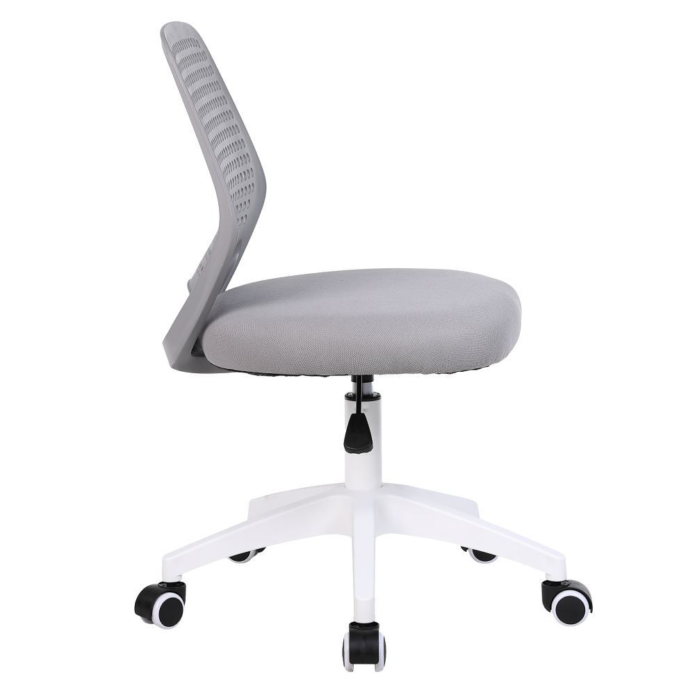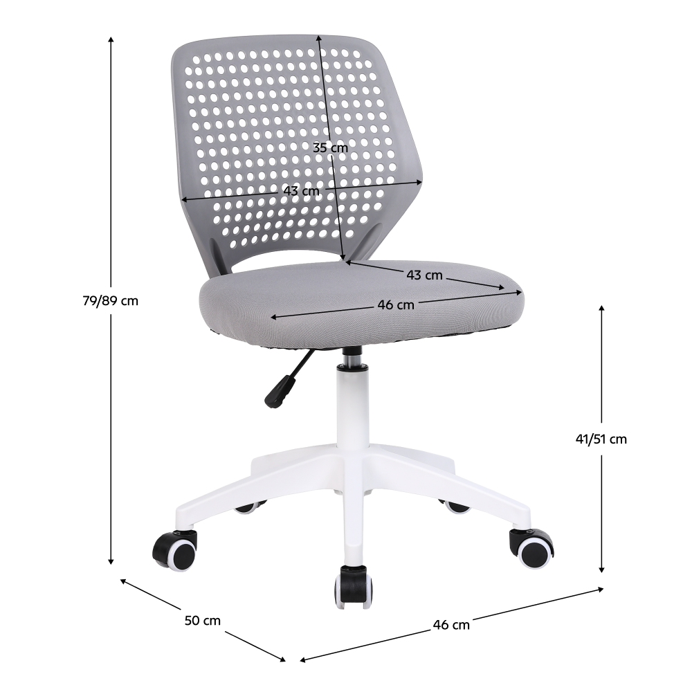 Material: plasă /plastic Rezistenţa ţesăturii la frecare conform testului Martindale: 15 000 de cicluri de frecare Culoare: gri/albă Dimensiuni (lxAxh): Înălţimea părţii de şezut: 46x50x79/89 cm 41-51 cm Lăţimea părţii de şezut: 46 cm Adâncimea părţii de şezut: 43 cm Înălţime spătar: 43 cm Lăţime spătar: 35 cm Portanţă: 100 cm Pivotant Roţi universale pivotante Potrivite pentru pardoseli dure şi moi Bază cu cinci braţe Livrat dezasamblat
