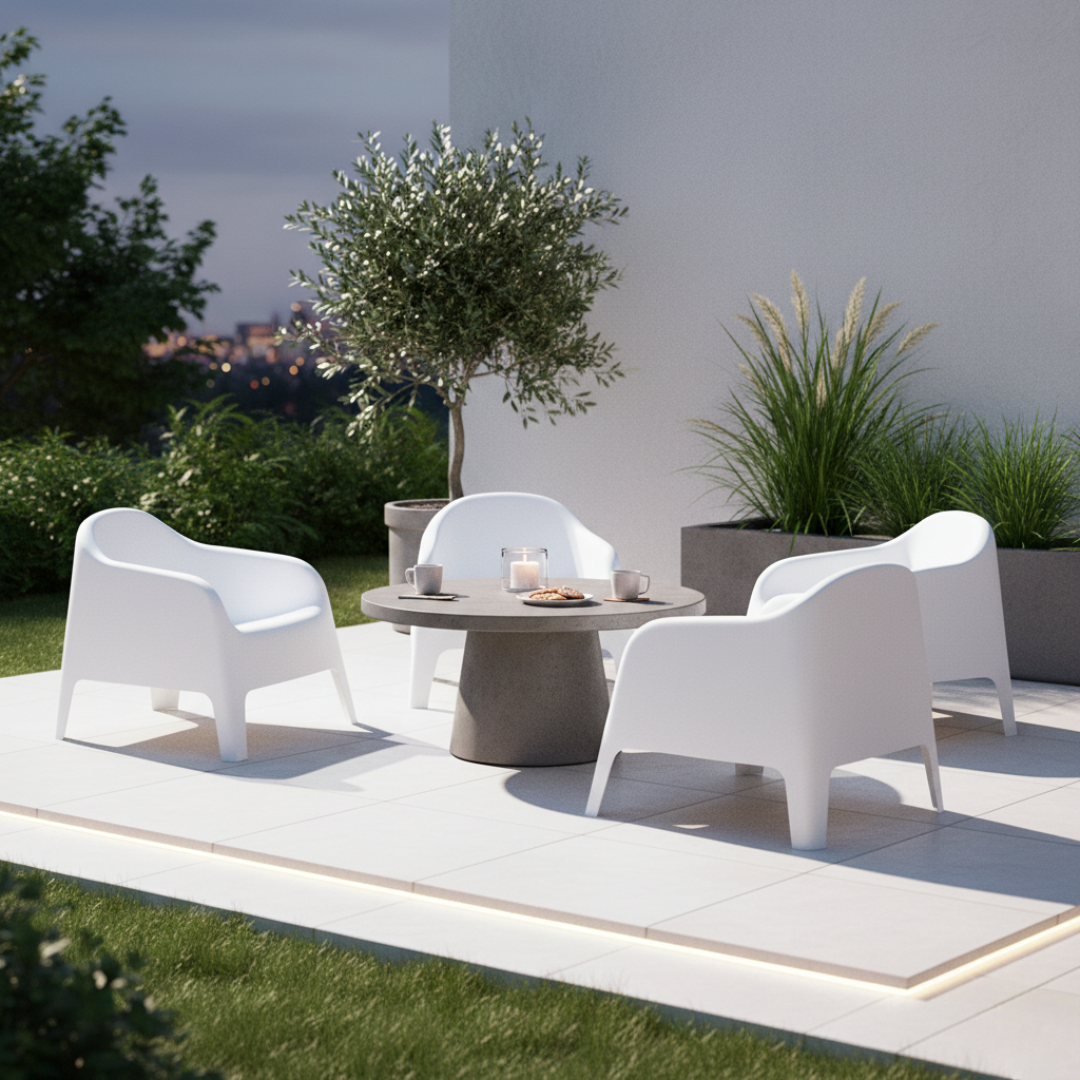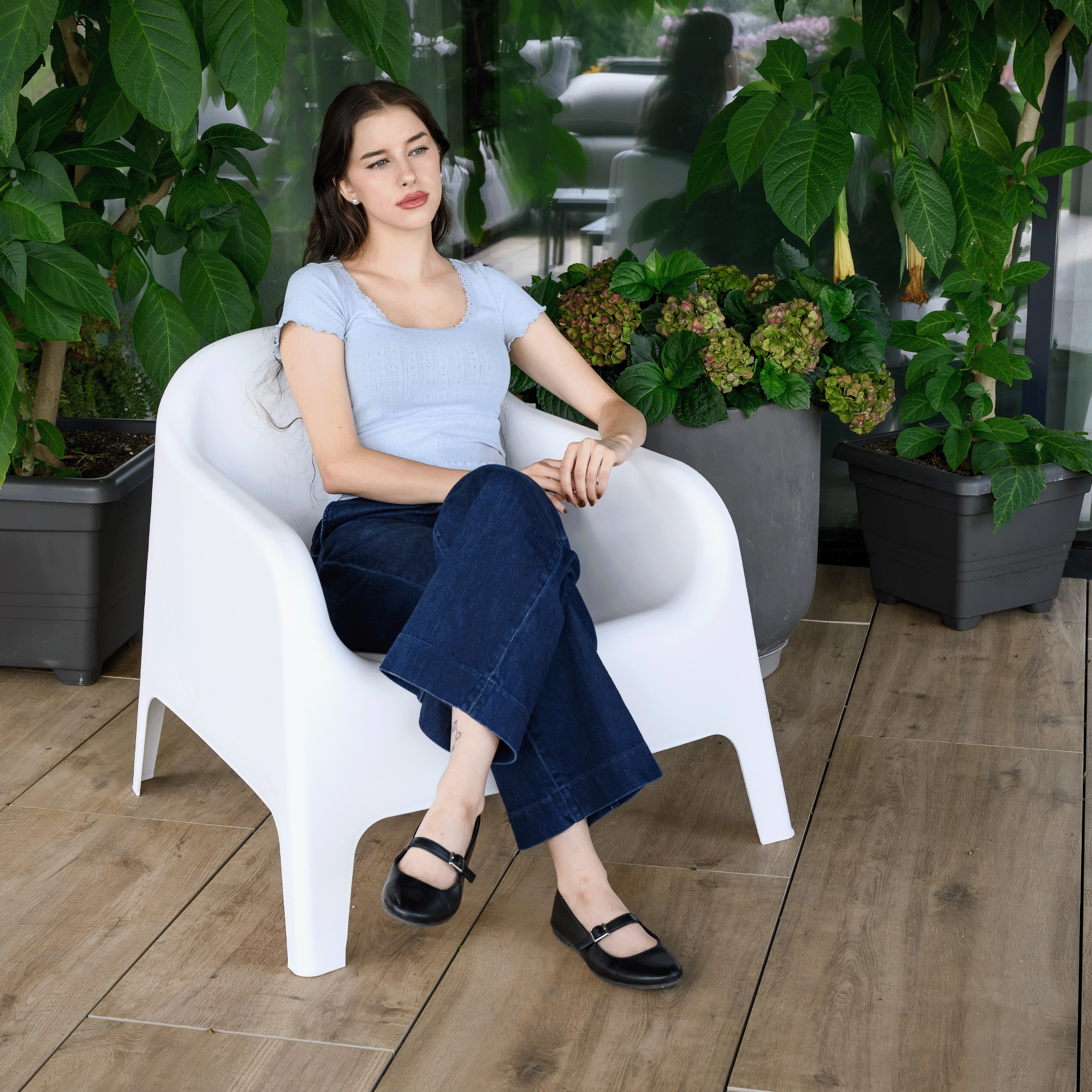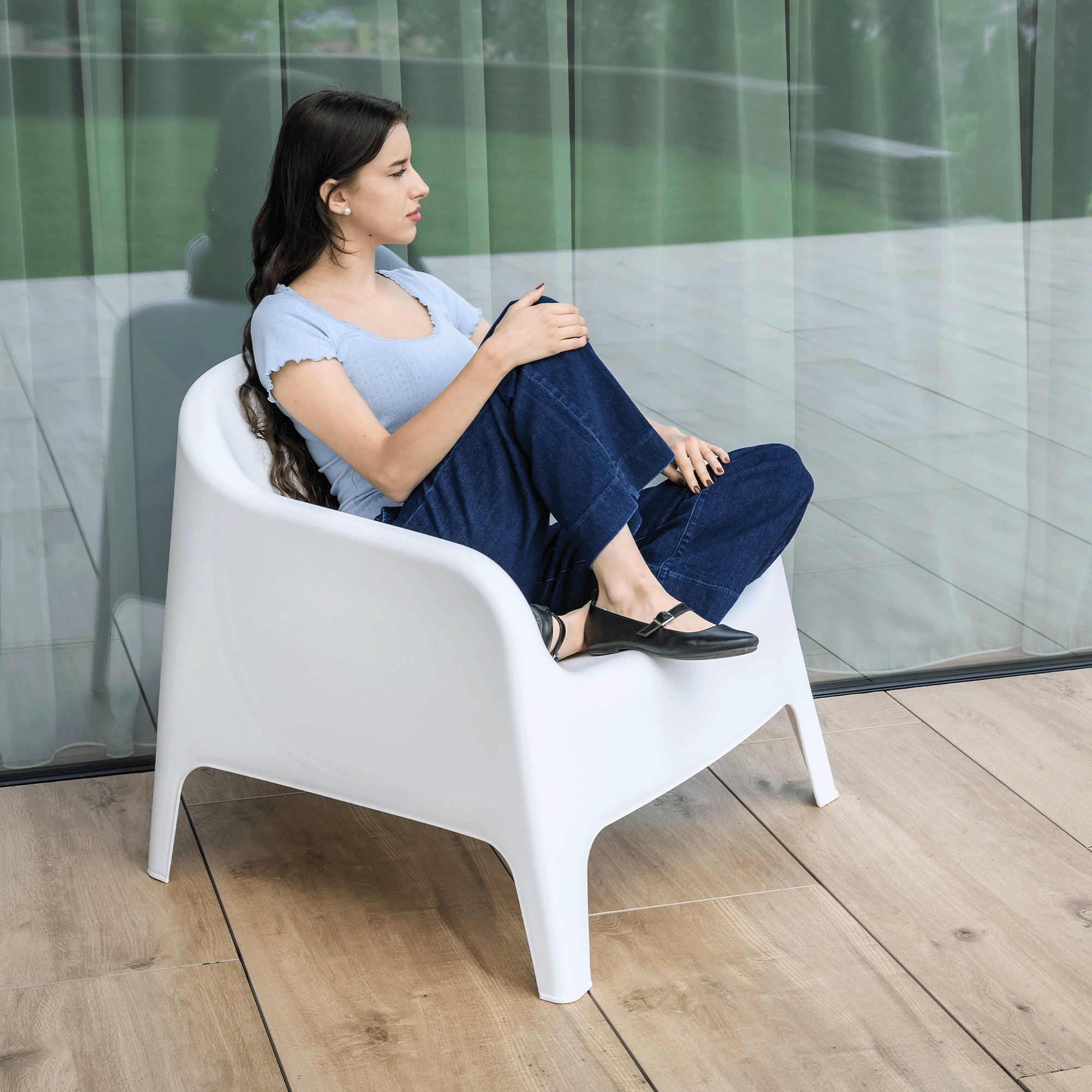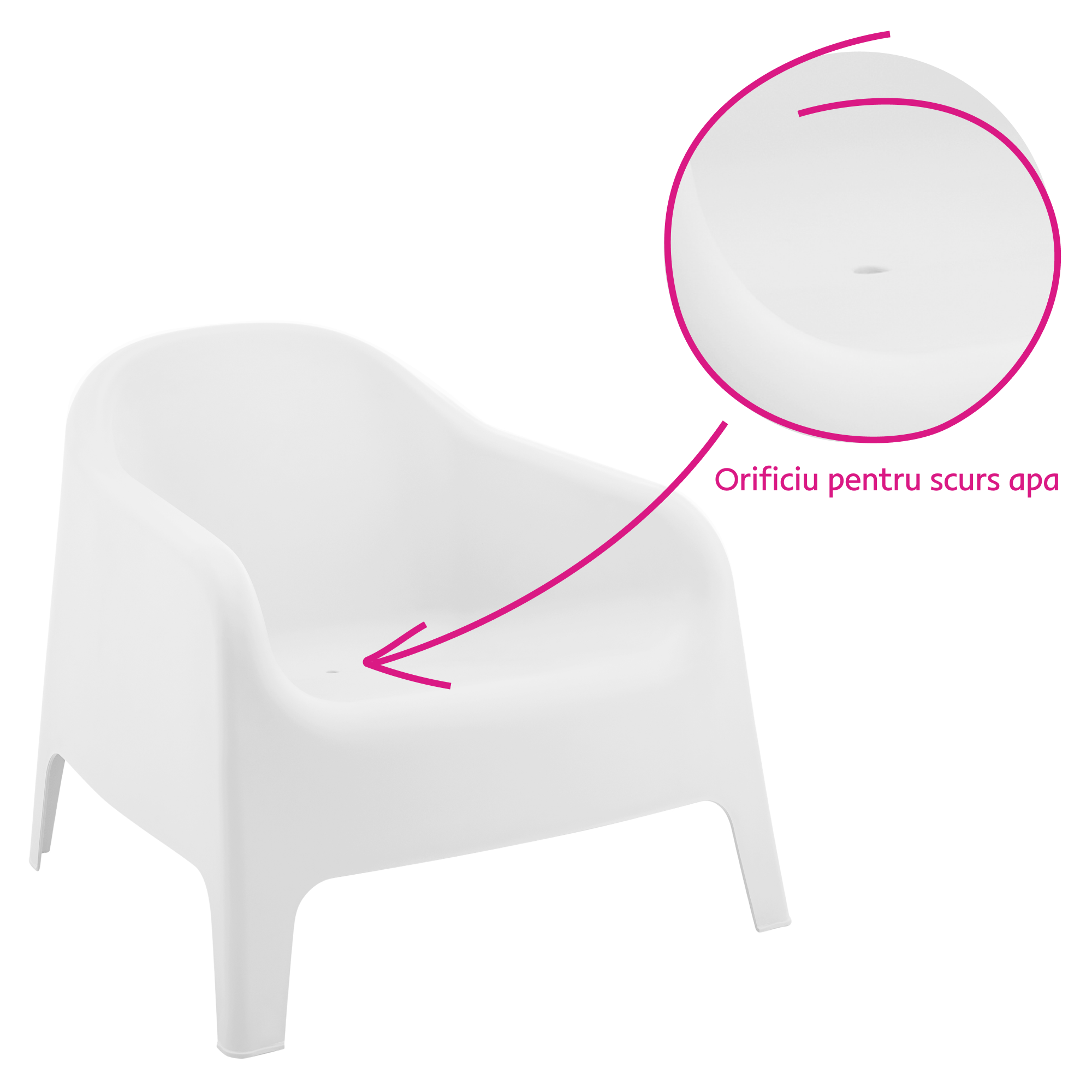 Material: plastic Culoare: albă Dimensiuni (lxAxh): 70x73x70 cm Înălţimea părţii de şezut: 37 cm Adâncimea părţii de şezut: 48 cm Lăţimea părţii de şezut: 52 cm Înălţime spate: 50 cm Stivuibile Cu filtru UV Potrivit pentru interior şi exterior Orificiu de scurgere în partea de şezut Portanţă: 100 kg Livrat asamblat
