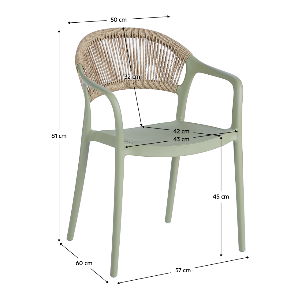 Material: plastic Culoare: verde/bej Dimensiuni (lxAxh): 57x60x81 cm, înălţimea şezutului scaunului: 45 cm Adâncimea părţii de şezut: 42 cm Lăţimea părţii de şezut: 43 cm Înălţime spătar: 32 cm, Lăţime spătar: 50 cm Portanţă: 100 kg Greutate: 5,5 kg Scaun de sufragerie Scaun de grădină Stivuibil Potrivit atât pentru utilizare în interior, cât şi în exterior Livrat asamblat
