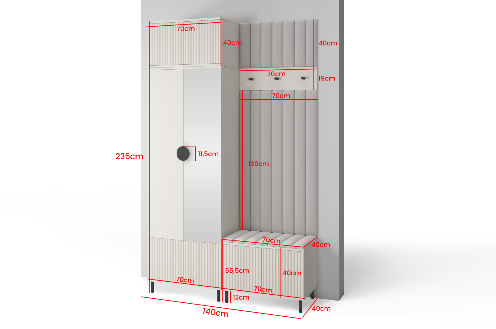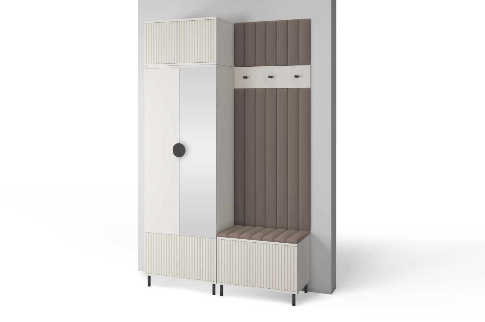 Set mobila hol /cuier cu dulap inaltat si panouri tapitate, cu oglinda/riflaje casmir /pal bej casmir/ stofa maro inchis , 140cm lungime x 235 cm inaltime x 40 cm adancime, picioare inalte
