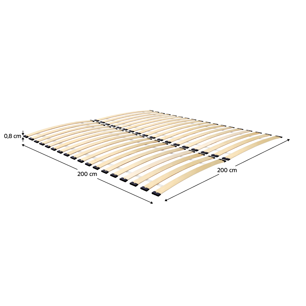 Material: lamele flexibile/bandă de tapiţerie/carcase din plastic Design: placaj de mesteacăn Dimensiuni (lxh): 200x200 cm Număr de lamele: 36 Grosimea lamelelor: 0,8 Lăţimea lamelelor: 5,3 cm. Spaţiul dintre lamele: 5,5 cm Portanţă: 150 kg/persoană Potrivit pentru toate tipurile de saltele Construcţie fără ramă Potrivit pentru paturi cu şine laterale pentru fixarea somierei Patul trebuie să aibă şină de mijloc pentru fixarea somierei Somieră roluibilă lamele din placaj de mesteacăn conectate cu bandă de tapiţerie Montate în carcase de plastic Livrată cu şuruburi pentru fixarea pe pat Somiera nu este auto-portantă Fiecare somieră este cu 1 cm mai îngustă şi cu 5 cm mai scurtă faţă de dimensiunea specificată, de exemplu 90x200 = 89x195 cm.
