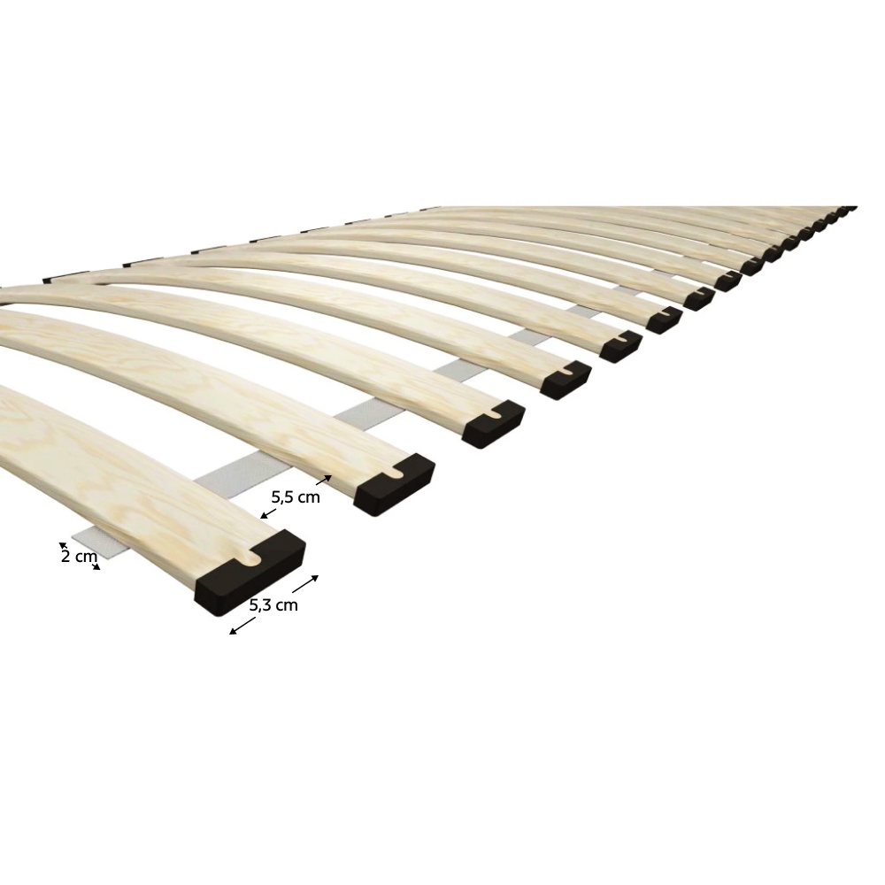 Material: lamele flexibile/bandă de tapiţerie/carcase din plastic Design: placaj de mesteacăn Dimensiuni (lxh): 80x200 cm Număr de lamele: 18 cm Grosimea lamelelor: 0,8 Lăţimea lamelelor: 5,3 cm. Spaţiul dintre lamele: 5,5 cm Portanţă: 150 kg/persoană Potrivit pentru toate tipurile de saltele Construcţie fără ramă Potrivit pentru paturi cu şine laterale pentru fixarea somierei Somieră roluibilă Lamele din placaj de mesteacăn conectate cu bandă de tapiţerie Montate în carcase de plastic Livrată cu şuruburi pentru fixarea pe pat Somiera nu este auto-portantă Fiecare somieră este cu 1 cm mai îngustă şi cu 5 cm mai scurtă faţă de dimensiunea specificată, de exemplu 90x200 = 89x195 cm.