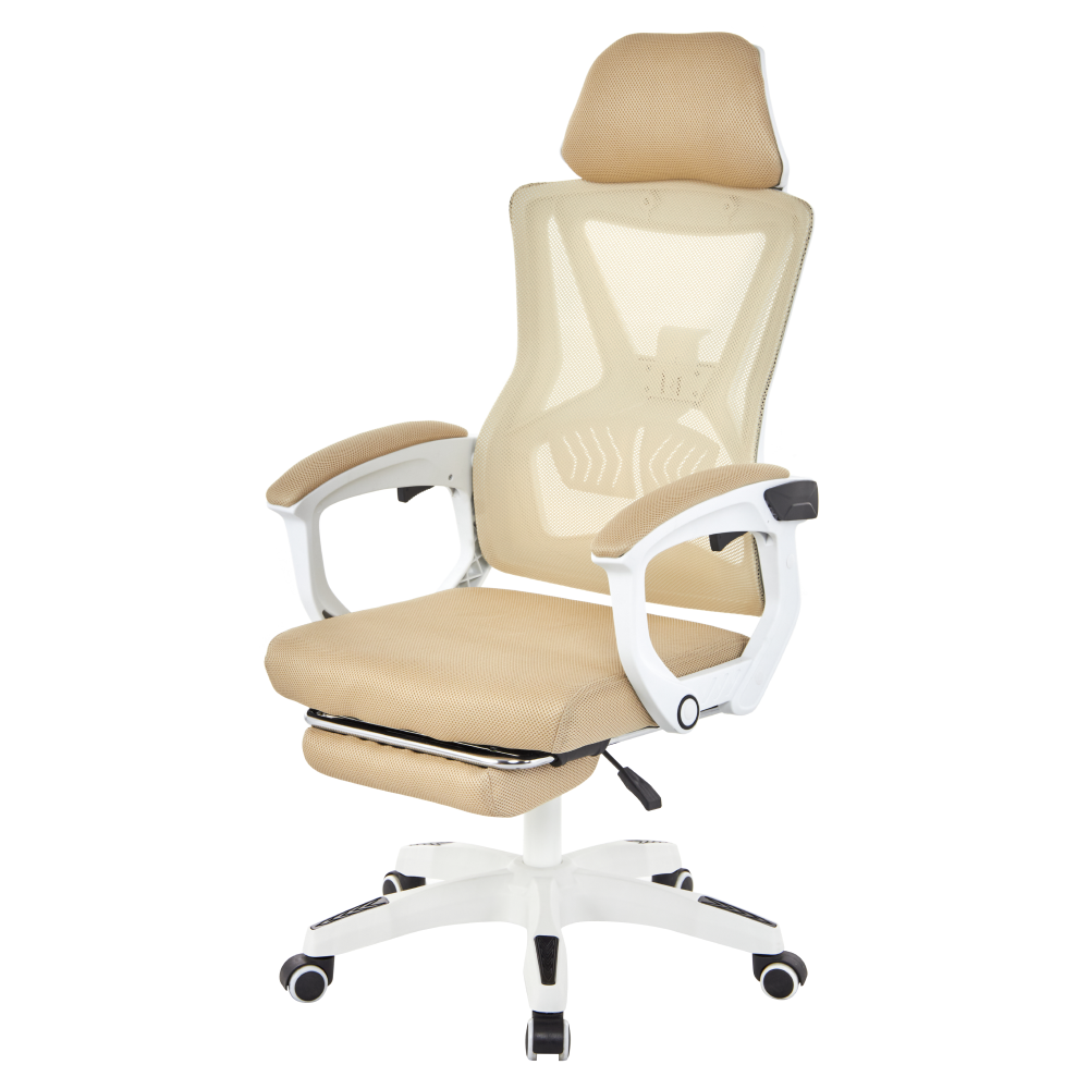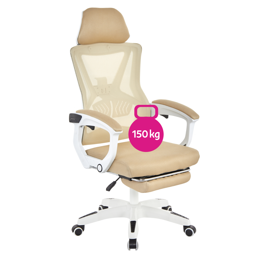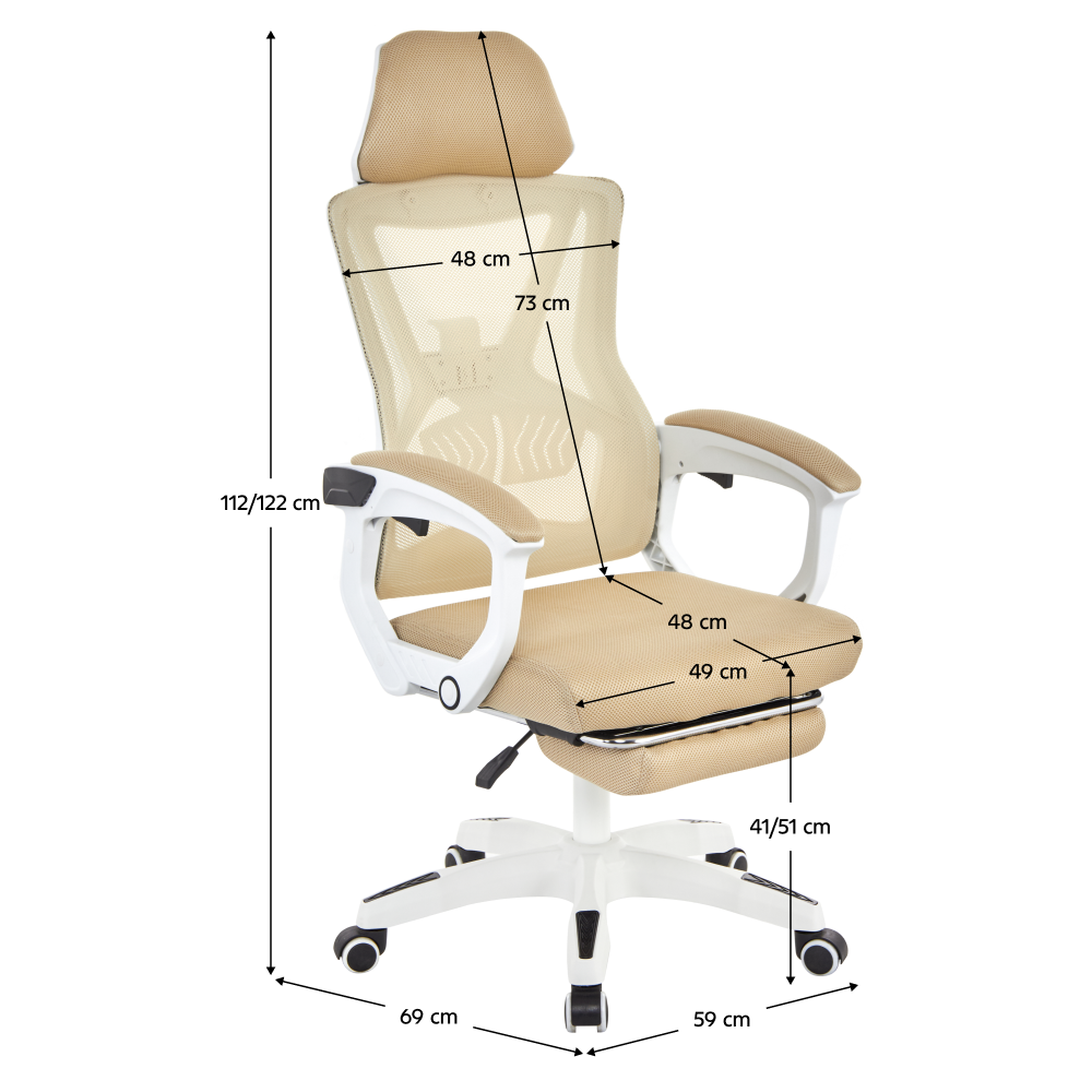 Material: plasă/plastic Rezistenţa ţesăturii la frecare conform testului Martindale: 90 000 de cicluri de frecare Culoare: bej/albă Dimensiuni (lxAxh): 59x63x112-122 cm Înălţimea părţii de şezu: 41-51 cm Lăţime scaun: 49 cm Adâncimea părţii de şezut: 48 cm Înălţime spătar: 73 cm Lăţime spătar: 48 cm Înălţime reglabilă a părţii de şezu Cotiere tapiţate Suport pentru picioare extensibil Spătar reglabil Reglare rigiditate lombară Mecanism de balansare Roţi universale Potrivite pentru podele dure şi moi Bază cu cinci braţe Portanţă: 150 kg Livrat dezasamblat