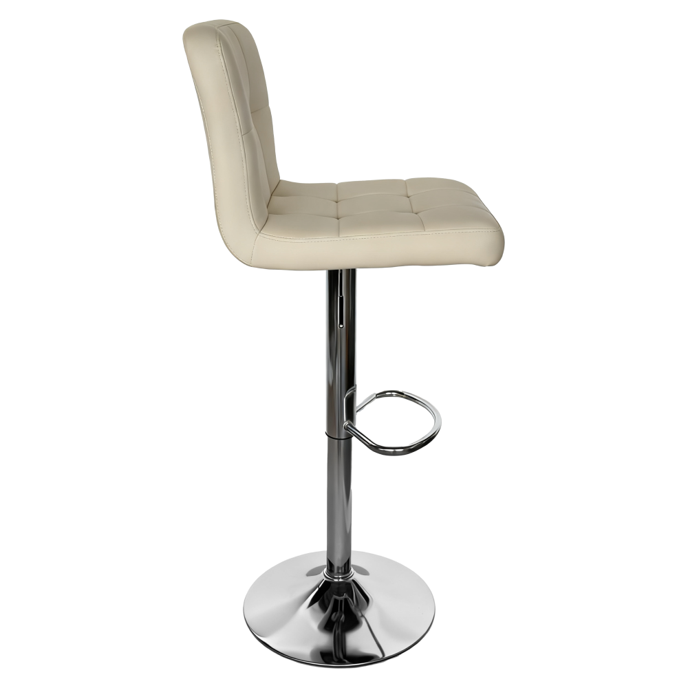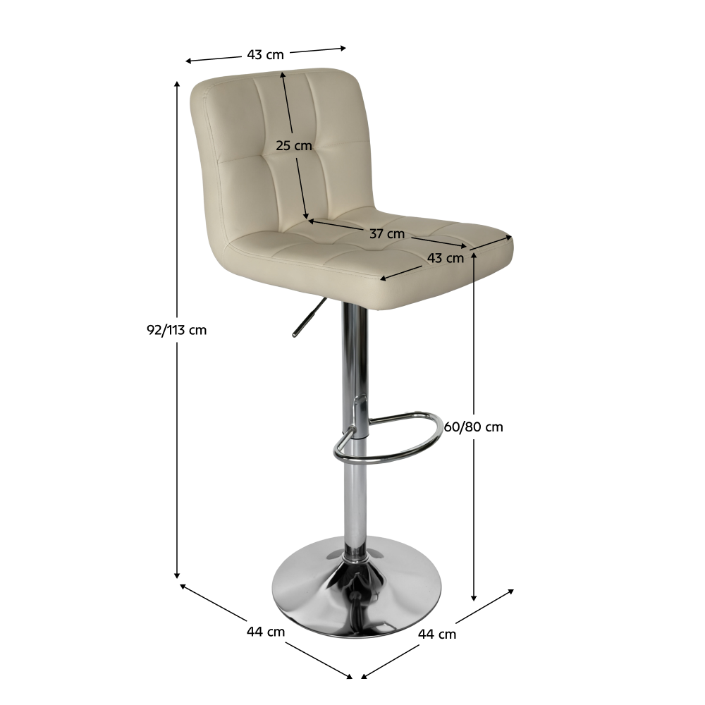 Scaun bar KANDY 2 NEW Material: piele ecologică/crom Rezistenţa materialului: 100 000 Martindale Culoare: bej Dimensiuni (IxAxh): 44x44x92-113 cm Şezut reglabil pe înălţime Reglare cu ajutorul manetei Înălţimea şezutului: 60-80 cm Adâncimea şezutului: 37 cm Capacitate portantă: 100 kg Cusătură decorativă Se livrează nemontat
