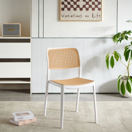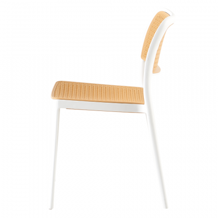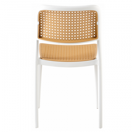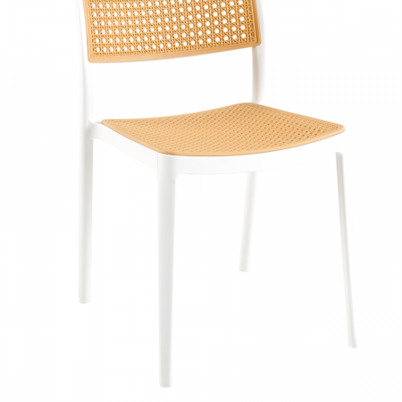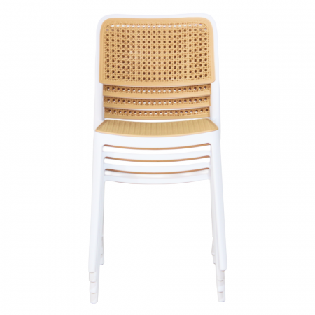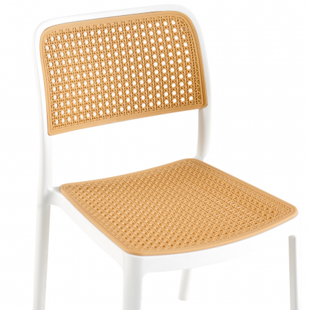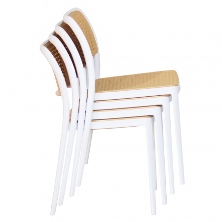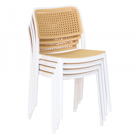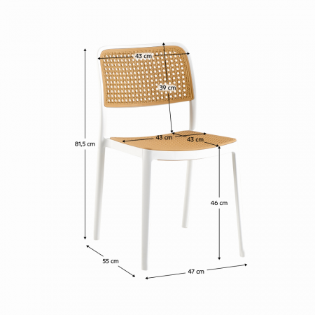 Material: plastic Culoare: albă / bej Dimensiuni (LxAxÎ): 47x55x81,5 cm Înălţimea scaunului: 46 cm Adâncime scaun: 43 cm Lăţime scaun: 43 cm Înălţime spătar: 39 cm Lăţime spătar: 43 cm Capacitate de încărcare: 100 kg Greutate: 4,7 kg Stivuibil Potrivit pentru interior şi exterior Livrat asamblat