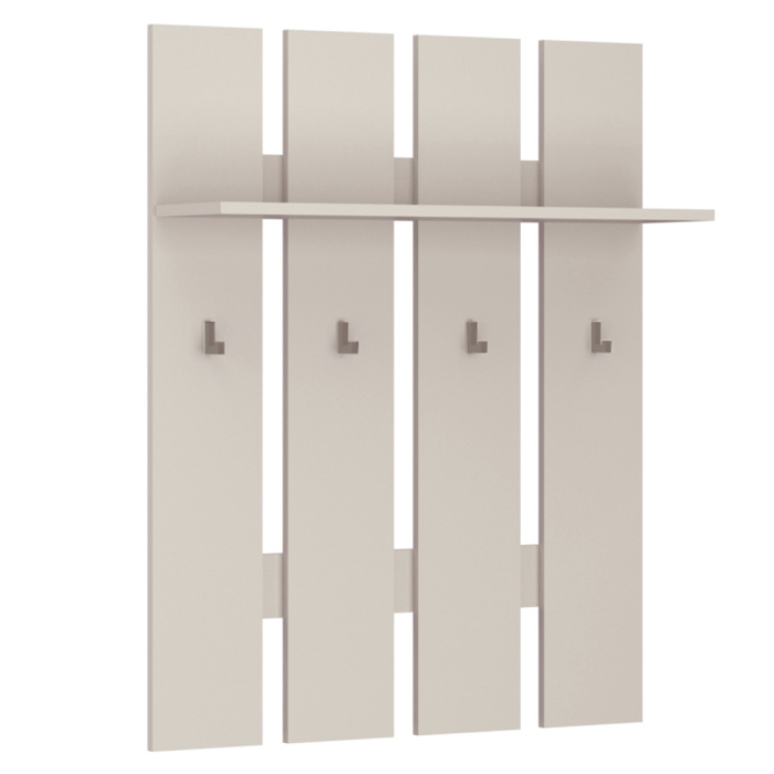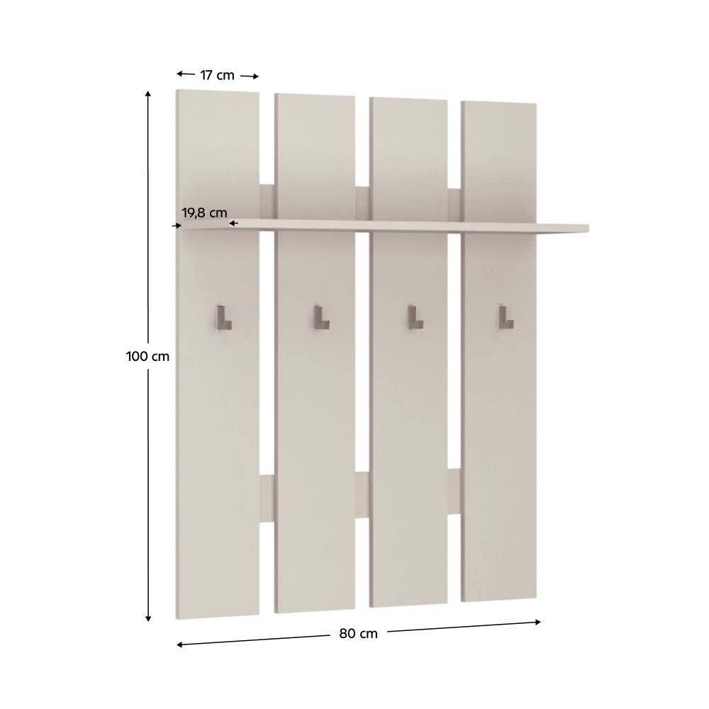 Material: DTD laminat Culoare: caşmir Dimensiuni (lxAxh): 80x23x100 cm Grosime material DTD: 1,6 cm Spaţiu de depozitare deschis Poliţă Portanţă poliţă: 3kg Patru cârlige Materialul cârligului: plastic Culoarea cârligului: caşmir Portanţă cârlig: 3 kg Picioare din plastic Vă recomandăm să ataşaţi mobilierul de perete Design modern Livrat dezasamblat