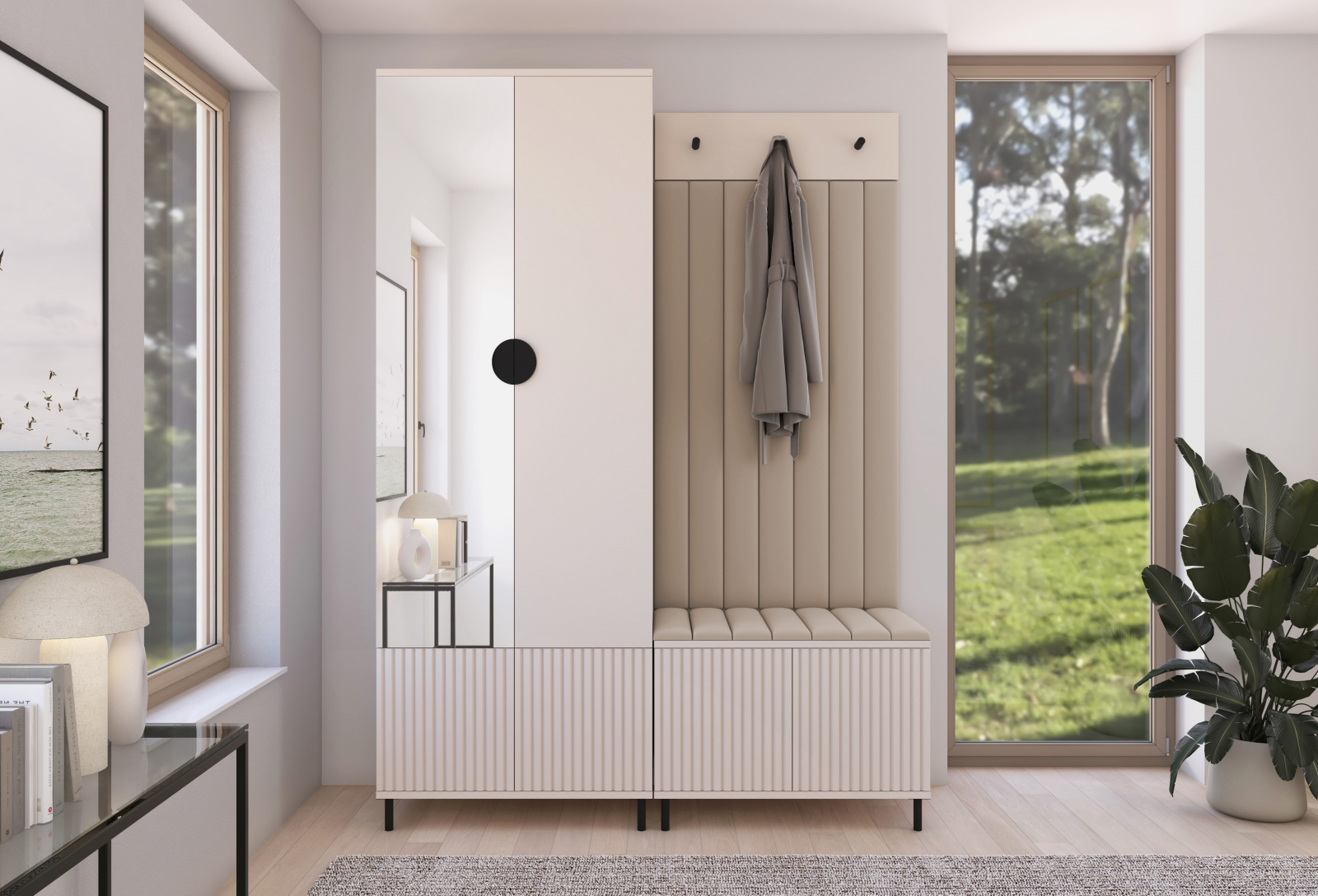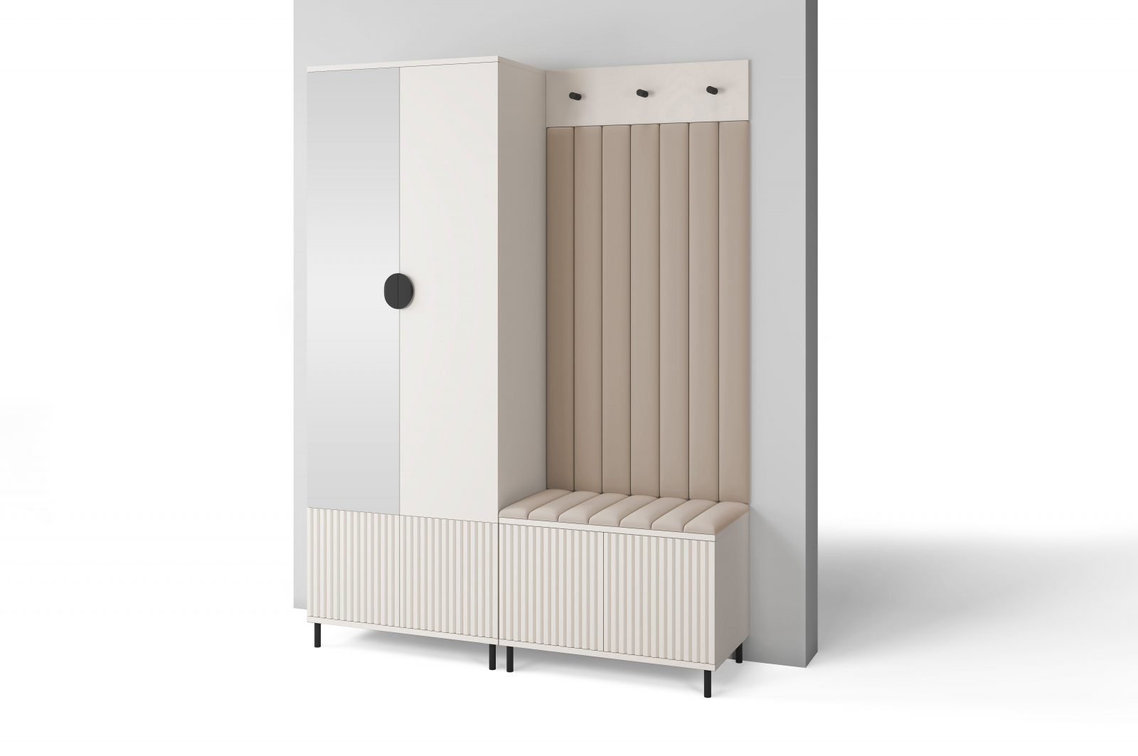 Set mobila hol /cuier cu dulap si panouri tapitate, cu oglinda/riflaje casmir /pal bej casmir/ stofa bej crem , 140cm lungime x 195 cm inaltimex 40 cm adancime, maner negru , picioare negre-