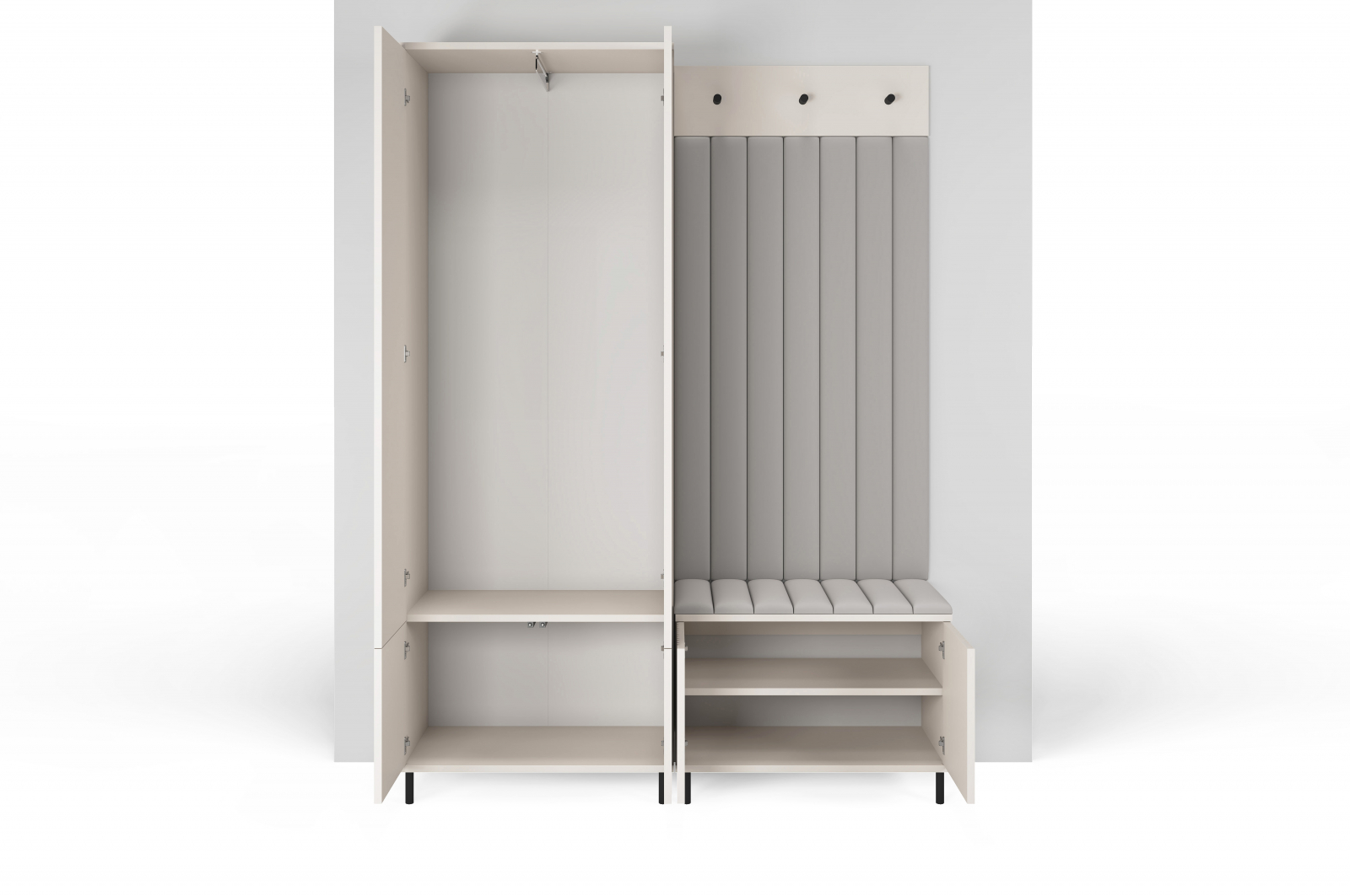 Set mobilier de hol , cuier cu dulap , pantofar , panouri tapitate si 3 agatatori, fabricat din pal laminta culoarea cashmere bej si usi , materiale de calitate folosite , 16 mm grosime , abs , feronerie metal /plastic .