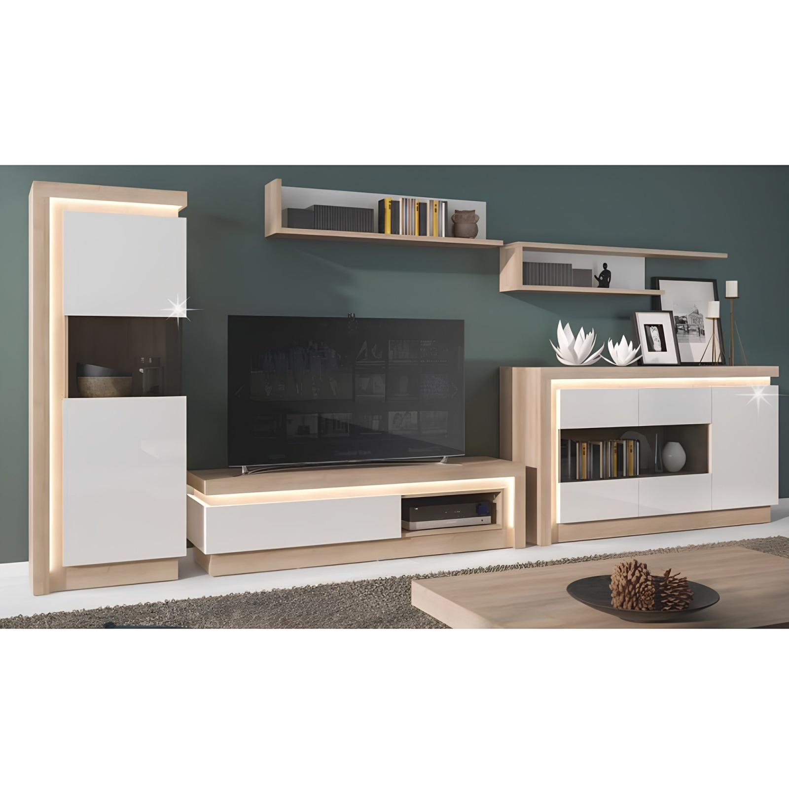 Vitrină LYOV01L din setul modular LEONARDO în culoare stejar riviera/alb cu luciu extra ridicat Dimensiuni (LxGxÎ): 60x42x164 cm Grosimea materialului: 16 mm Sistem de oprire silenţioasă a uşilor Iluminarea LED din jurul perimetrului este inclusă Livrat nemontat