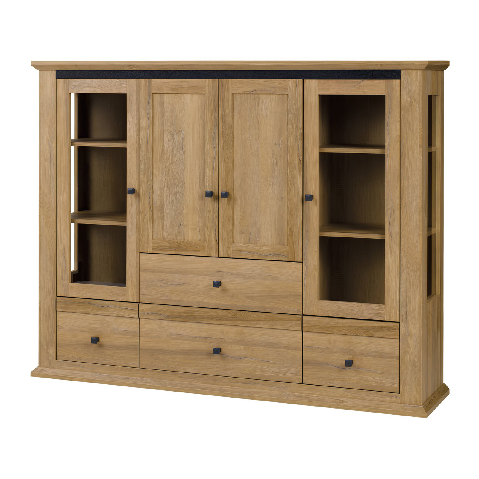 Material: DTD laminat/muchii ABS Culoare: stejar grand Dimensiuni (LxGxÎ): 165x40x130 cm Grosimea materialului: 40 mm Patru uşi Patru dulapuri De sticlă Cu poliţe Patru sertare Cu mânere Cu efect 3D Elegant În stil provensal Mânere din metal Furnizat nemontat